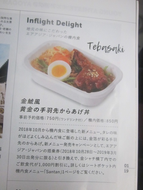 中でも驚いたのは、最近、また名古屋めしの新しい機内食メニューが開発されたそうで、それを記念して、対象期間(2018年10月28日~2019年3月30日)の期間中のDJ搭乗券を名古屋城傍で最近人気の金シャチ横丁の店舗に持って行くと、何と飲食代が1000円も割引になるというキャンペーンを開催しています(いました)。