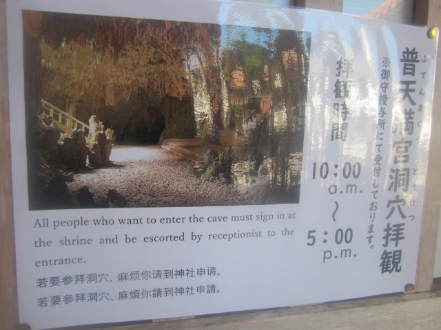 ただ、ここの最大の見所は、本殿よりも寧ろその横にある洞穴で、普段は施錠されていますが、受付すると無料で見物可能です。巫女さんの案内で開錠して途中まで案内してくれますが、洞穴内では30分の時間制限(実際はそこまでかかりません)でお願いします、と言われ、フリータイムで楽しめます。