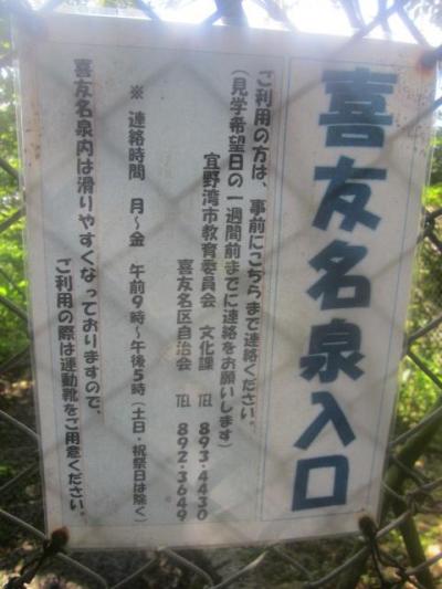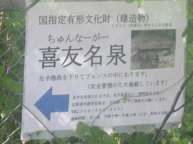 国道330号線沿いの普天間と国道58号線沿いの伊佐とを繋ぐ県道81号線沿いにあります。小さな標識がそれを示していますが、車からだと見逃してしまう程度の規模です。道路からは泉に続く古い下りの石畳道があって、ここの風情がなかなか素晴らしいです。ただ、肝心の泉のエリアに関しては、普段は施錠されていて、見学希望の場合は、見学希望日の1週間前に宜野湾市教育委員会文化課に、事前予約が必要な旨が掲示されていました。尚、石畳道の入口付近には現代風の泉が設置されていて、お水に関してはここで得ることが可能です。