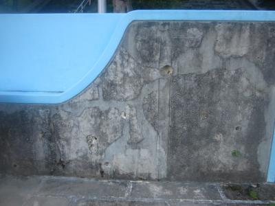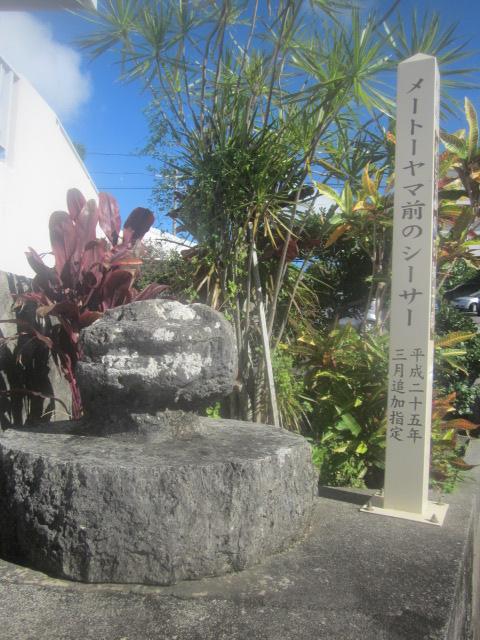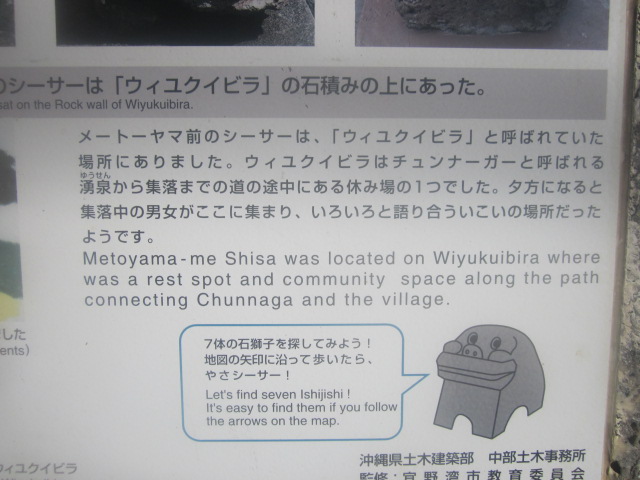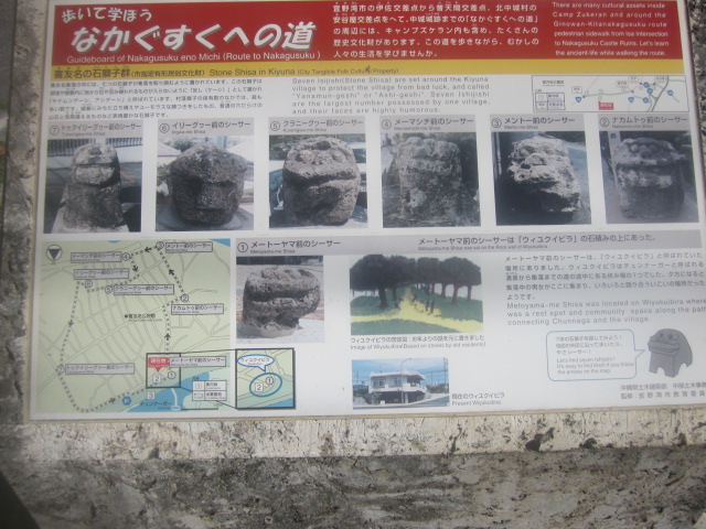 普天間と伊佐とを繋ぐ県道81号線沿いのキャンプ・ズケランから見て、道路の対岸の住宅地に点在しているのがこちらの石獅子(シーサー)群です。この県道を歩いていてたまたま見つけたのですが、全部で7体の、昔から大切にされてきたことがよく解る、悪く言えば、壊れかけたような、それぞれ個性的なシーサーが観られて、とても楽しかったです。ただ、ちょっと道が解り辛い箇所もありますので、県道入口に設置されている案内板をきちんと撮影して、それを見ながら丁寧に巡ると無駄なく巡れると思います。