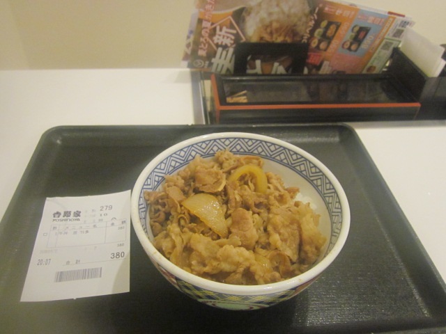 都会のど真ん中にある吉野家店舗で、回転率最優先のレイアウトとしてのカウンター席のにょろにょろ具合、スタッフの方がほぼ外国人、忙しく食べてすぐに退店する客の流れなど、田舎者的には、「ザ・都会のファストフード店」を体感できる店舗だと思います。通常はこういう光景には田舎者としてはうんざりしてしまうものなんですが、ここまでシステマティックに機械のように人が動いている姿を見ていると、何やらチャップリンの映画を見ているような喜劇テイストも感じられて、案外楽しかったりもしました( ´∀` )。