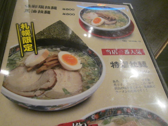 札幌駅直結のエスタ10階にある札幌ら~めん共和国内にある一店舗です。元は函館のお店ですので、やはり一押しは塩拉麺となるようですが、この店舗では、札幌限定メニューとして特塩拉麺というのが一番人気となっているようでした。あっさりとした味付けで、コクのあるスープが美味しかったです。お昼時でも、隣接の他店舗と比較すると若干空いているように感じましたが、これはタイミングの問題なのかもしれません。