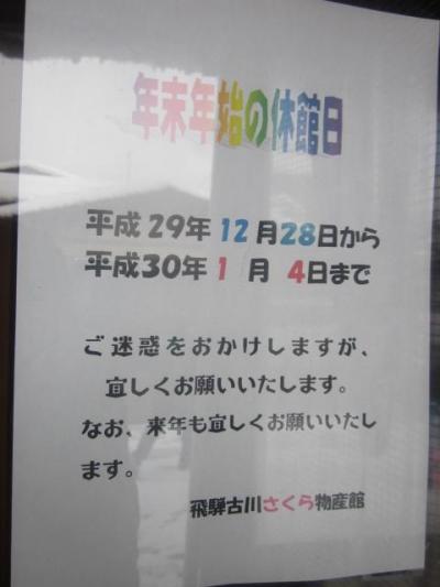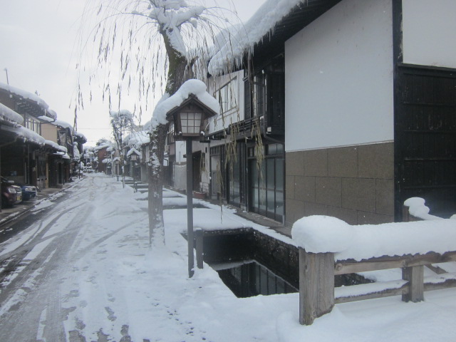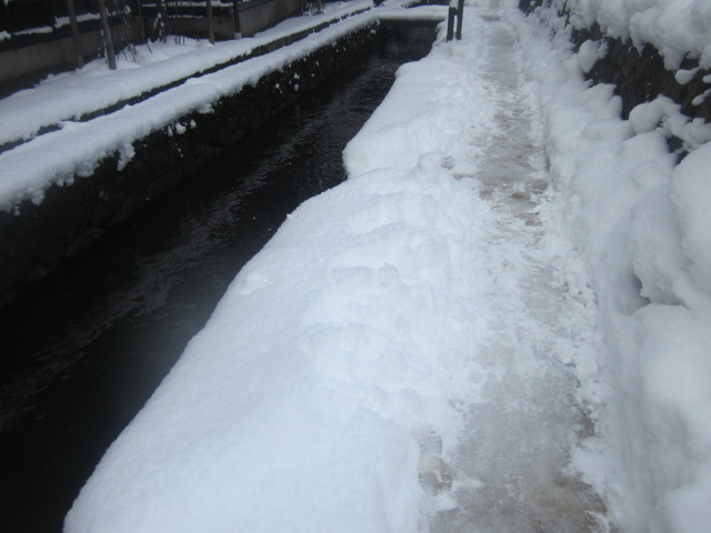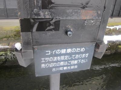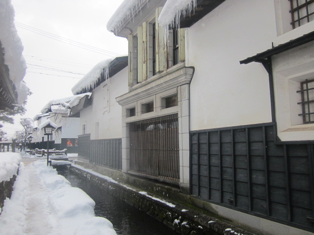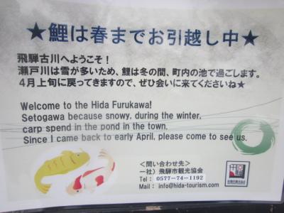 飛騨古川の象徴ともいえる景色として、観光シーズンには鯉が泳ぐ姿も見られる瀬戸川ですが、1月に訪問してみると、鯉の姿は一切見られませんでした。何でも町内の池に避難されているようで、流石、観光地の鯉だけに、手厚く保護されているのだなあと感動しました。雪の時期は瀬戸川沿いの踏み跡が滑りやすくなっていてちょっと危ないので、特に雪道歩きに慣れていらっしゃらない方は、滑って川の中にドボンしてしまわないように、くれぐれも御注意下さい。