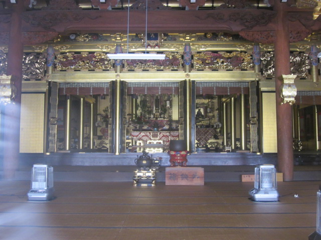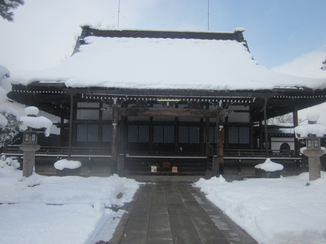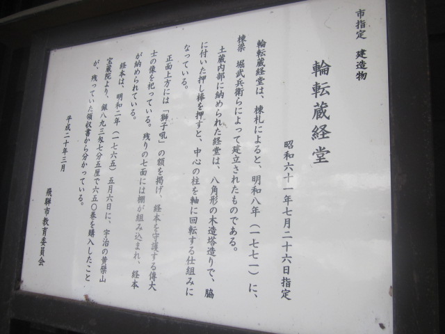飛騨古川市街地の一番西寄り、荒城川に架かる赤い欄干で存在感を示す今宮橋の袂にある浄土真宗のお寺で、毎年1月15日の三寺まいりの一寺にも数えられている名刹です。外観はシンプルな風情ですが、ここは何といっても本堂内の金箔に覆われた装飾が素晴らしく、飛騨の匠の技術が見事に生かされた龍や亀、麒麟の装飾などは一見の価値があります。また本堂脇の輪転蔵経堂と呼ばれる、内部に回転式の八角形の経堂が収められているお堂も見応えがありますので、併せてご覧になってみて下さい。