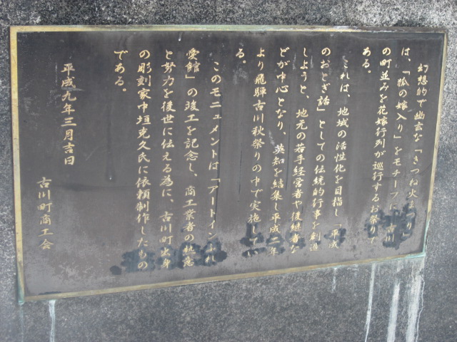 毎年、飛騨古川の市街地で開催されている秋まつり(毎年9月第四土曜日開催)のようで、地元では春の古川祭、冬の三寺まいりと併せて、賑わいを見せるイベントとして有名になっています。私は冬季の訪問でしたが、三寺まいりでもお馴染みとなっている真宗寺の向かい、くみひも体験などができることで近年人気を博している飛騨古川さくら物産館のすぐ隣に、可愛らしい狐さんが数匹デザインされた像が建っています。こちらは一年中見られますので、ぜひ確認しに足を運んでみてください。