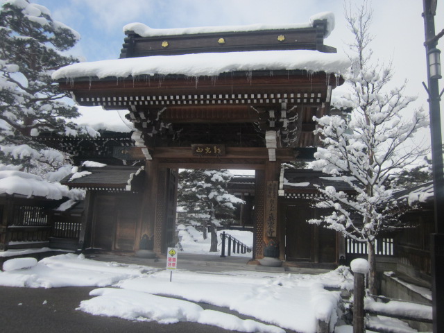 飛騨古川の市街地にあるお寺で、毎年1月15日には、「三寺まいり」で賑わう浄土真宗のお寺です。すぐ脇を、飛騨古川の象徴といえる瀬戸川が流れていて、風光明媚なエリアにあるお寺ですが、立派な山門や「水呼びの亀」と呼ばれる、防火のシンボルとしての装飾など、平時に訪れても見所が多いお寺です。