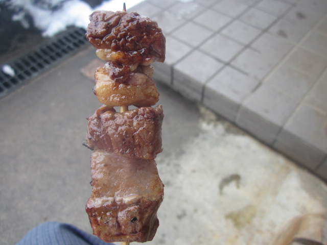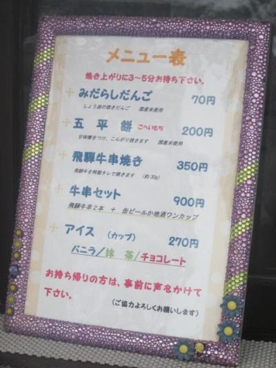 飛騨牛といえば、日本国内を代表する高級和牛の一つでもありますので、庶民レベルではお財布的に敷居が高いというイメージがありますが、そんな方にお勧めなのがこちらのお店で販売されている飛騨牛の串焼きです。1本350円という比較的リーズナブルなお値段で、ジューシーな炭火焼きの飛騨牛の串焼きが味わえる、ということで、地元の方にも人気を博していますが、それ以外のみたらし団子や五平餅なども人気があって、大量オーダーしていく地元の方の姿もよく見かけました。混雑時は待たされることがありますので、出来るだけ空いている時間帯の利用をお勧めしたいお店です。