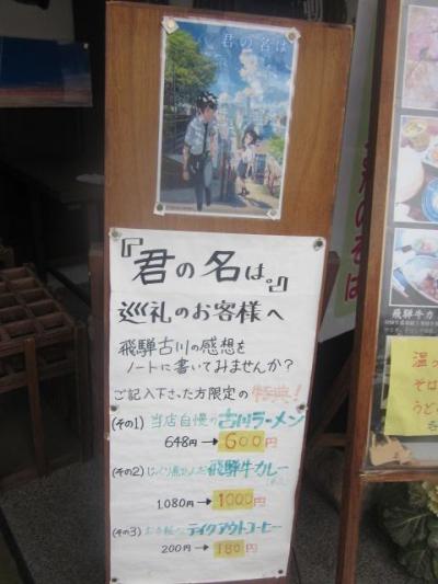 2016年に大ヒットしたアニメ映画「君の名は。」の舞台の一つとなっている飛騨古川では、今も尚、同映画ファンの方々の巡礼が絶えない人気を博していますが、町ぐるみで映画を応援している雰囲気もあって、実益も得られるという意味では、このお店などが町内巡礼の休憩先としておすすめだと思います。お店に用意されたノートに何かコメントを書き残すだけで、各種メニューが割引となりますので、映画の巡礼目的でいらした方は、是非立ち寄って頂きたいお店です。