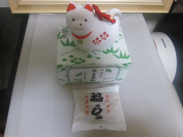 参拝後に頂ける福豆のデザインは昨年と同じ、この年の干支である戌の土鈴は500円(二匹の紅白バージョンだと1500円)となっていました。