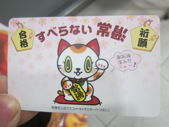 空港の案内所と比較すると、いつも空いていて(あまり良いことではないですが)、対応もとても親切なのが好感持てますし、常滑は”常に滑る”と表記するのを逆に捉えて、滑るの字が逆さになった、猫の受験生(?)が可愛らしい風情で、”常に滑らない”をアピールしている”ミニ常滑神社”が常滑駅構内に設置されているのですが、この観光案内所では、それに加えて、受験生のお守りとして、この”逆さ滑る”の文字がプリントされた、「すべらない常滑」カードも配布されています。常滑の観光が目的でなくても、是非、多くの受験生に立ち寄って頂きたい案内所です。- 旅行時期