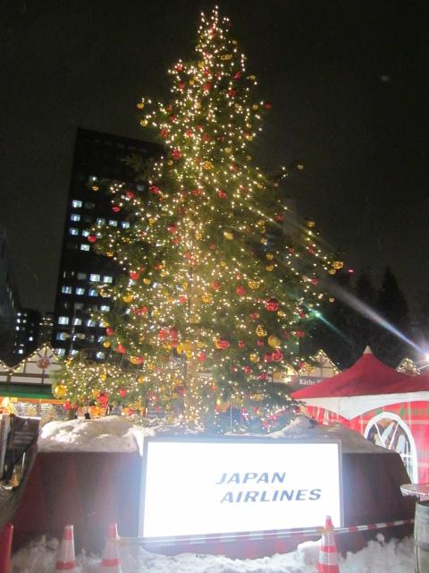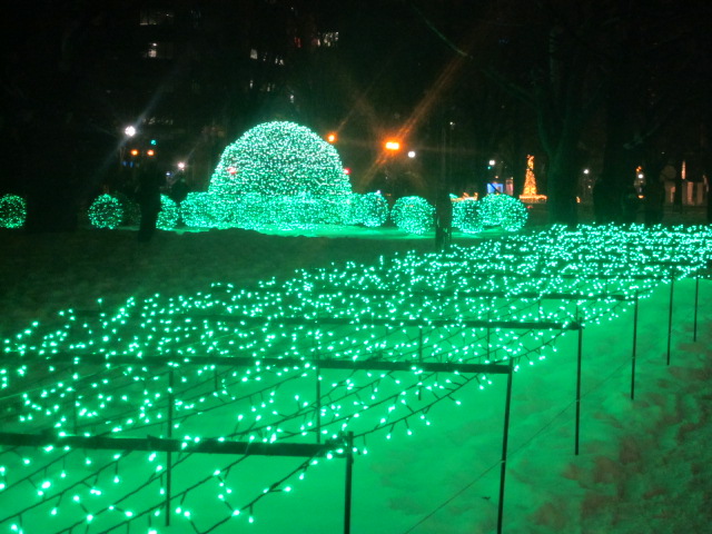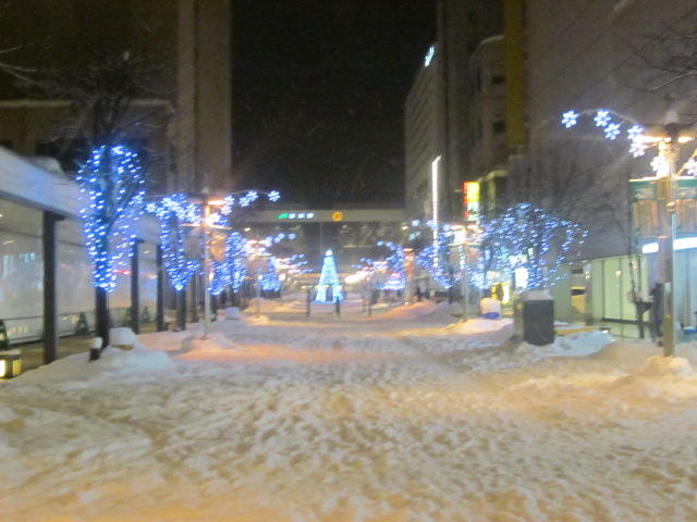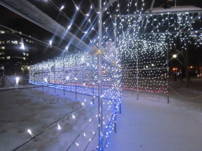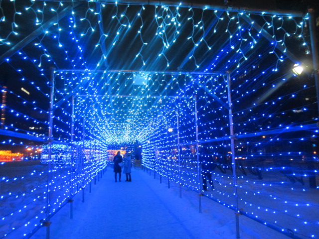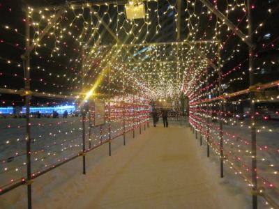 道都の札幌がホワイトイルミネーションで輝く季節、第二の都市旭川のイルミネーションといえば…。寧ろ旭川駅から続くメインストリート、買物公園が電飾で輝くのは2月の冬まつりシーズンで、雪まつりシーズンの札幌のすすきのと同じように、ライトアップされた美しい氷像が並ぶ光景が見られたりするのですが、12月に関してはとてもひっそりとしていて、申し訳なさそうに入口で輝く小さなツリー風の電飾(中が通り抜けられるようになっている)が、逆に情趣あって良い雰囲気です。