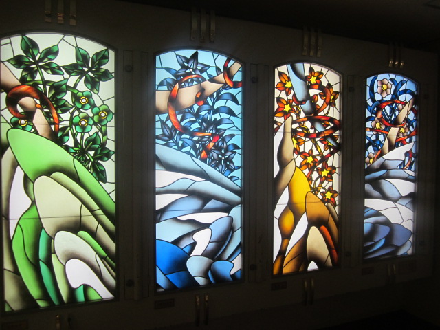 札幌もJRタワーが開業してから、いわゆる”サツエキ(札幌駅)”エリアがショッピングの主流となり、劣勢に立たされている印象が強い大通界隈ですが、ここを東西に貫く地下街、オーロラタウンで個人的に気に入っている作品が、2丁目付近にあるステンドグラス風の作品です。
