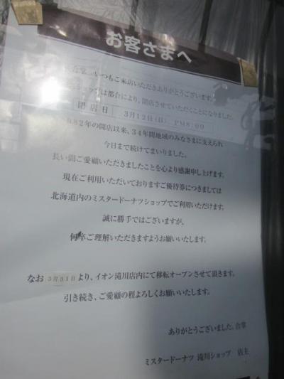 ミスタードーナツの滝川駅前のショップとしては、2017年3月に閉店してしまいました。滝川駅界隈には、他に大手のファストフードチェーン店がなくて、列車待ち合わせの際にはこれまでにもよく利用してきた店舗だったのですが、やはり車社会の北海道の典型といえるのが現在の北海道の地方都市の現状だと思います。