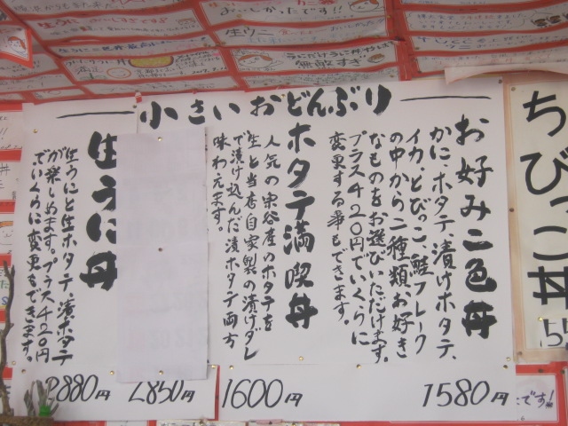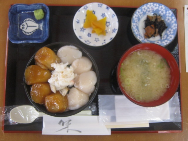 私は二番目に安かった「ホタテ満喫丼」(1600円)というのをオーダーしましたが、宗谷産ンの新鮮な生帆立と、特製の醤油に漬け込んだ、づけ帆立とが半々に盛られていて、とてもボリュームがあって美味しかったです。