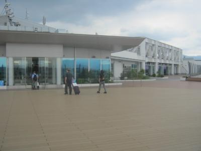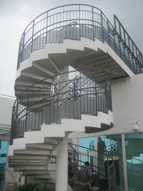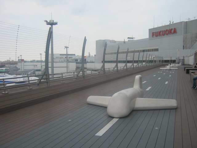 福岡空港国内線ターミナルのデッキは、デザインがちょっと個性的で、通常だと展望デッキといえば、屋上階のワンフロアということが多いと思いますが、ここのデッキは二層になっていて、双方を螺旋階段経由で直接移動することもできます。(それぞれの階にも勿論直結の出入口があります。)