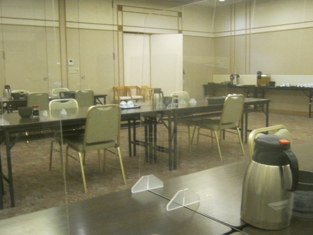今回は朝食も付けましたが、お膳タイプの和朝食で、ホテルの宴会場を朝食用に運用している感じでした。お客さんの数にも依るのかと思いますが、私の訪問時は空いていて、スタッフの方にじっと見守られている形での朝食は、若干緊張感がありました。ご飯や味噌汁はおかわり自由となっていて、最初から用意されているお膳以外に、飲み物などが置かれたテーブルの横に、生卵・納豆・ふりかけ・海苔なども用意されていますので、こちらも忘れずに頂くようにしましょう。