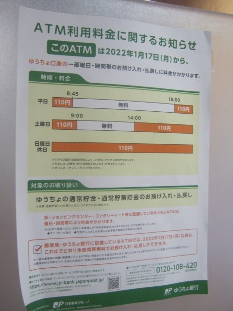 私はここのATMは、郵便局のATMだから、日曜日でも手数料がかからないと思って、少額を引き出して唖然、なんと110円が徴収されているではないですか!