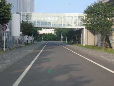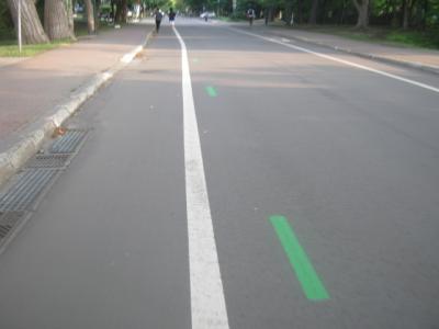 路面にはまだ、恐らくは国際的な公認コースとしての正確なコース取りが要求されたと思しき、コースのラインが緑線で等間隔で連綿と続いていて、マラソンコースとしての名残を感じることが出来ました。