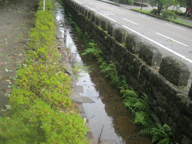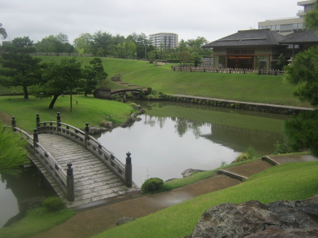 周囲を見渡すと、金沢城としての石垣がかなりの高さで残されているため、それを背景に眺めると、スケールの大きな庭園が更に大きく感じられました。