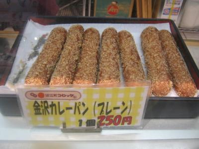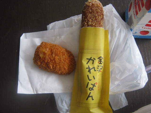 美味しそうな商品が色々と並んでいたのですが、貧民の私には珍しく、ちょっと贅沢をしようと300円もする甘えびクリームコロッケと、細長い形状がインパクトあった金沢カレーパン(250円)というのを購入してみました。