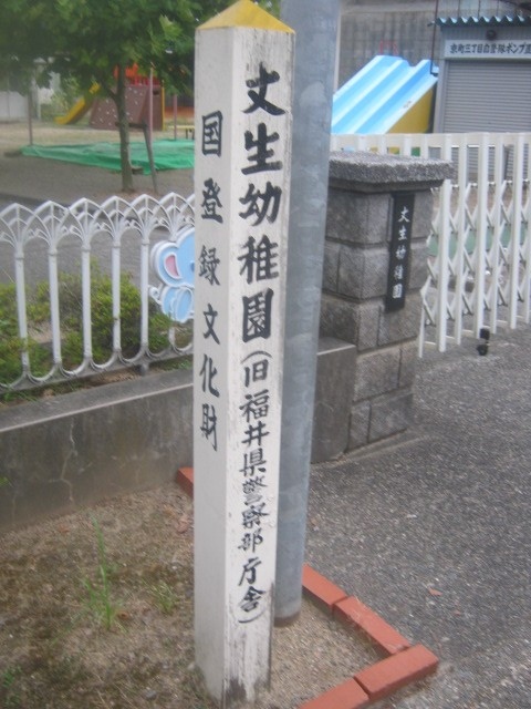 武生が誇る名刹、引接寺の境内にある、元々は福井県警察部庁舎として使用された歴史的建造物です。ライトグリーンの美しい建物で、外観を眺めるだけでうっとりとしてしまいますが、現在は現役の幼稚園として運用されていますので、お子様を入園でもさせない限りは、平時においては内部見学できないのが残念です。