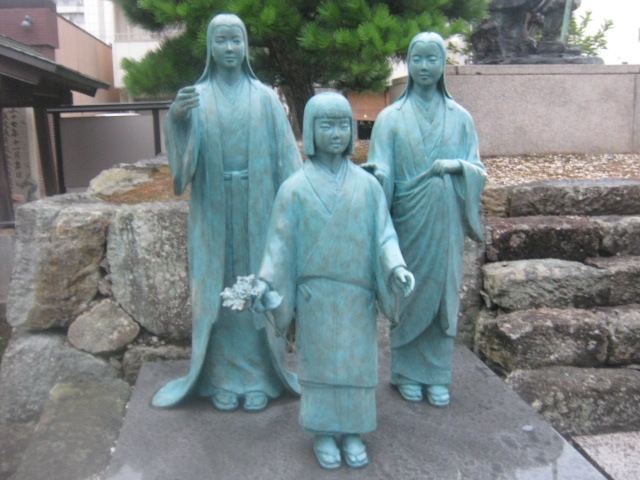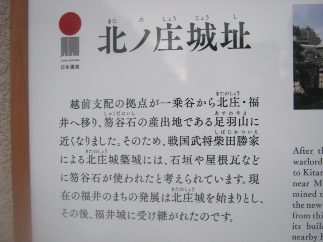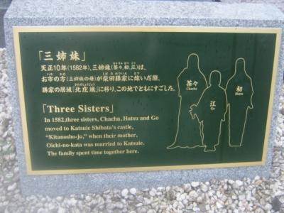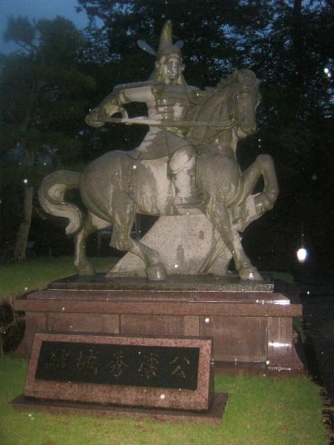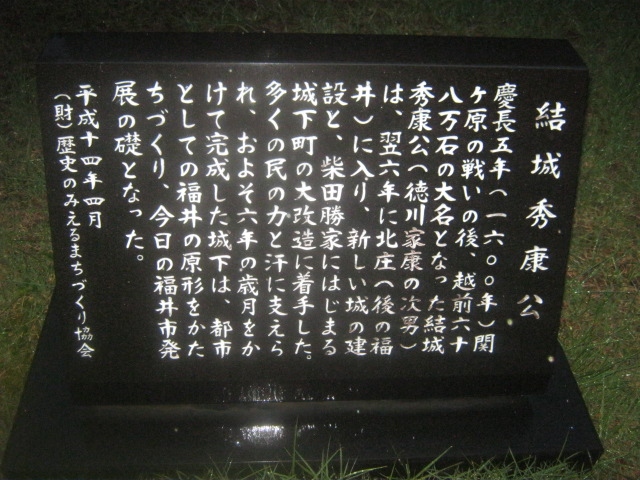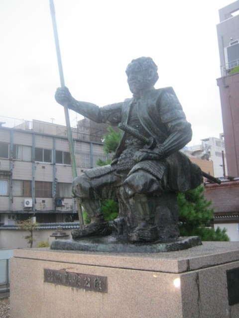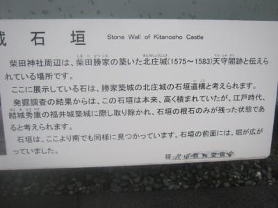 柴田神社境内、というか、柴田公園内というか、微妙なところに建っている(スタイル的には座っている)像です。丁度、北の庄城址を示すちょっと古い風情の石碑の隣にあって、これらがちょっとした石垣っぽい上に配置されているため、案外、近距離での撮影が難しいです。撮る場合はこの石垣から降りて、公園の散策道が続く側から撮る方が安全です。