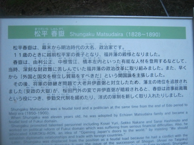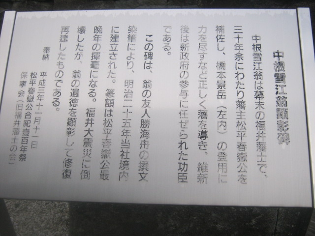 南側の鳥居傍には中根雪江翁の顕彰碑もあり、こちらも要注目です。氏の偉業に関しては解説をご覧頂きたく思いますが、この碑自体、福井大地震の際に倒壊したのを修復再建したものだそうで、石碑の途中に修復跡と思われる繫ぎ目なども見られますので、是非ご注目下さい。- 旅行時期