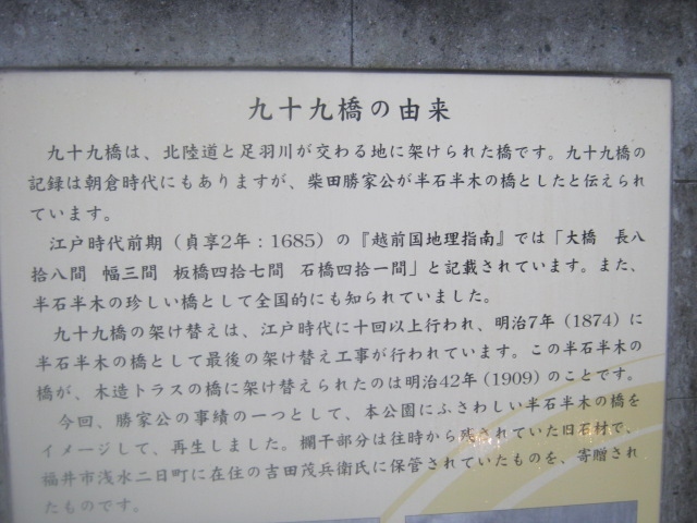 寧ろ観光客的視点からは、柴田公園の南側にひっそりと復元して展示されている九十九橋の方がお勧めで、往時の写真なども解説板に付されていますので、より参考になるかと思います。