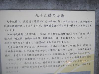 九十九橋は福井市街地の西寄り、元々は芦原街道の要衝として足羽川に架かる橋でしたが、今見られる橋は普通のコンクリートの橋なので、風情を楽しむスポットではありません。