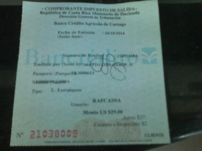 最近は事前に航空券代金に含まれていることが多い出国税に関してですが、コスタリカでは現在も尚出国時に専用カウンターで出国税のチケットを購入するシステムになっています。しかも同時に出国カードのようなものも書かされた上で、通常の搭乗手続きカウンターに進む、という流れになりますので、意外とチェックインの前段階で色々と時間がかかりますので、余裕を持って空港に足を運ぶようにして下さい。尚、私が携えていた3年ほど前の某外資系有名ガイドブックには26USドルと記載されていましたが、2014年10月現在で29USドルとなっていました。