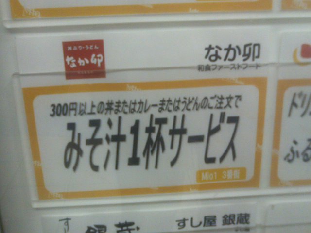 こちらのなか卯店舗は、京成千葉中央駅の構内、ミーオというショッピングモール内のフードコートにあり、他店舗と座席が共同になっているのが良いです。また、すぐ近くにローザという映画館がありますが、こちらの半券を呈示すると味噌汁がサービスになる特典もあるので、映画を見てからの利用が特にお勧めです。