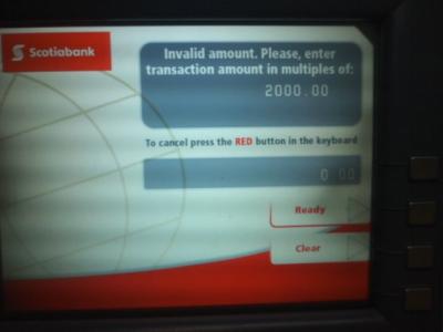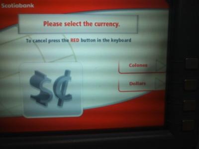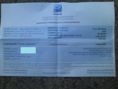 今回、サンホセに到着して、他の町でも多くあるように空港の両替レートは悪いという一般常識がこの町でも該当するかどうか試してみました。空港の両替所、街中の両替所のそれぞれで、同じ日の銀行営業時間帯内に20USドルずつをコロンに両替してみた所、前者は9353コロン、後者は10660コロン、と実に1300コロンほど(約250円)の差が付いてしまいました。両者とも領収書を見る限り特筆されたコミッションは徴収されていませんでしたが、両替時のカウンターのお姉さんの話では(但しスペイン語なので私が理解しうる範囲内ですが…)、レートにコミッションが含まれるようなことを話していました。約2000円の両替で250円も差が付くのはちょっと大きいと思いますので、コロンがない方は最小限の両替を空港でして(サンホセ市街地まではバスで100円程の運賃で出られますので、取り敢えず1000コロン程度あれば十分でしょう)、残りは街中で両替されると良いかと思います。また、キャッシングの場合は、レートが若干落ちる欠点があるものの、銀行にも拠るとは思いますが、コロンか米ドルかをチョイスできること、コロンではミニマム2000コロン(約400円)から下ろせますので、キャッシングが可能な方は、空港ではミニマムキャッシングで済ませて町に出られることをお勧め致します。