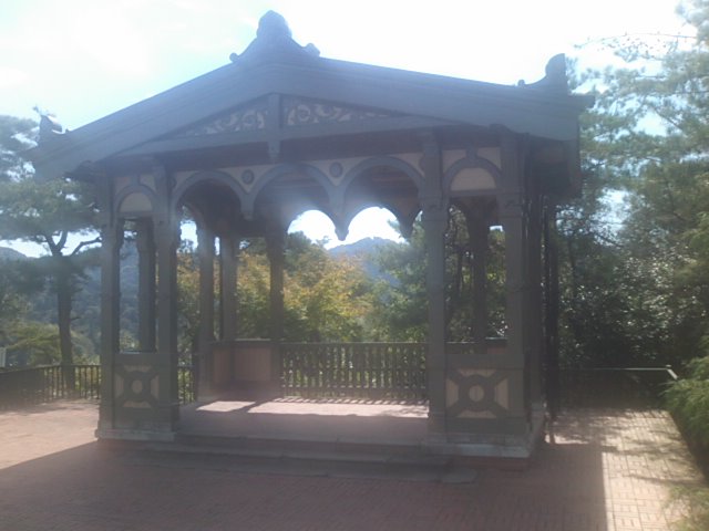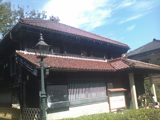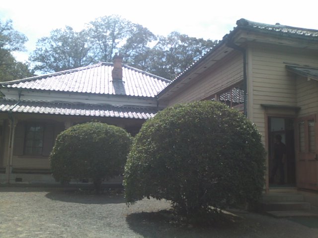 広い明治村の中でも一番最南部に位置しているのがこちらの建築で、日本庭園に囲まれた静かな一角にひっそりと佇んでいて、混雑を避けてゆっくりと休憩するのに良いスポットだと思います。ここからも入鹿池が望めますが、展望のレベルとしては、3丁目の品川燈台や宗教大学車寄の方が上かと思います。