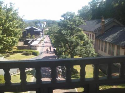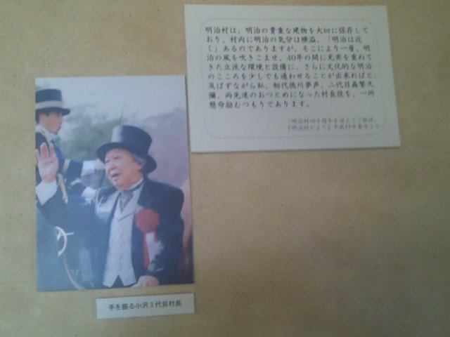 明治村の二丁目エリアは、レンガ通りを中心にスタイリッシュにまとまっている印象がありますが、その通りの最奥で存在感を示しているのがこちらの建物です。緩やかな上り坂の一番上部に位置するような立地なので、明治村らしい風景を感じるのにも良い建物だと思いますが、ここは明治村の村長室が設置されていることでも知られています。まあ、村長とはいっても、”名誉職”のようなものですので、まだ歴代に3名の村長しか誕生してませんが、2012年に逝去されたばかりの、三代目村長小沢昭一氏のにこやかな姿の写真などにとても癒されました。