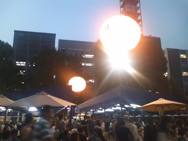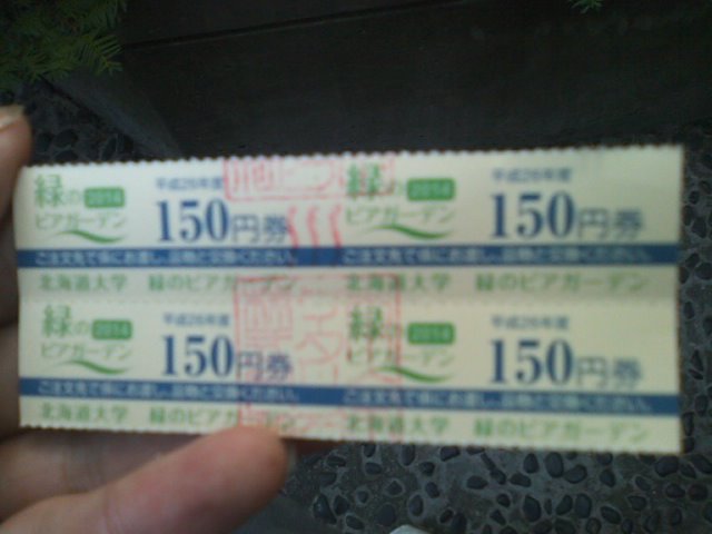 大学構内のビアガーデンということで、少し堅苦しい雰囲気なのかなと身構えて足を運んでみましたが、そんなことは全くなく、1枚150円のチケットを利用してビールやおつまみを購入するリーズナブルな料金システムも良心的でした。ビアガーデンとしてのテーブル数は少な目ですが、付近が芝生になっているので、ビニルシートを敷いてカジュアルに楽しんでいる方が多く見られました。