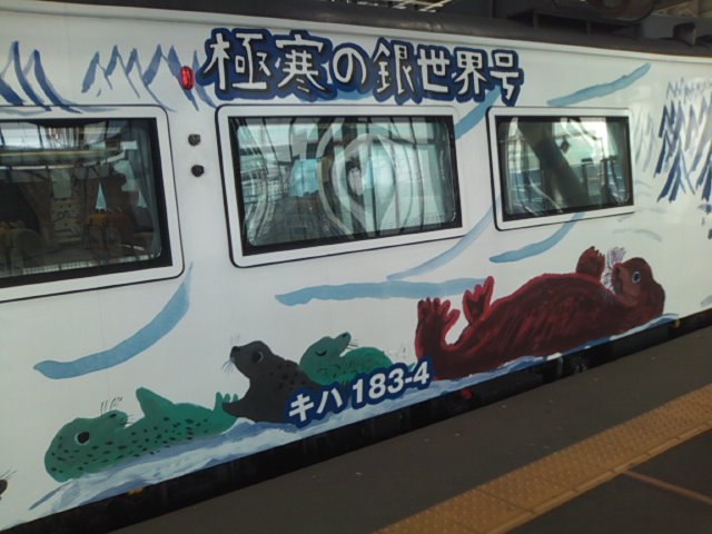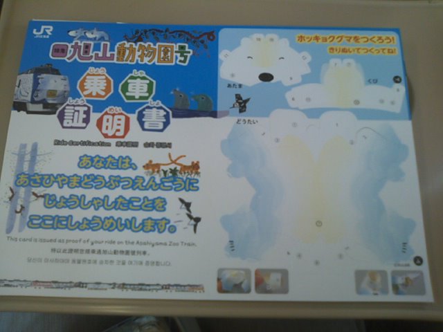 リニューアルされた旭山動物園号に2014年の夏、初めて乗車してみました。以前の動物園号は、各車両が動物の名前で解り易かったのですが、リニューアルされた車両の各名称は極寒の銀世界号とか、草原のサバンナ号とか、動物が暮らす地理的状況から名付けられています。子供さんにはちょっと解り辛いかな、動物名の方がシンプルでよかったのになとも思いました。尚、乗車証明書は組み立て式のペーパークラフトが付属していて、お子様には喜ばれる仕様ですが、記念に取っておきたいという方にはちょっとふにゃふにゃの安っぽい紙を使用していて、グレードダウンした感は否めませんでした。因みに、札幌→旭川ではキリン、旭川→札幌ではホッキョクグマのペーパークラフトになっています。