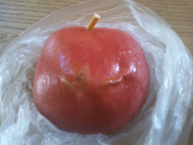 剣淵の道の駅は、ユニークなパンが色々と販売されていることで地元民には有名ですが、この度はリンゴパンを発見しました。柄の部分にポッキーが使用されていました。お値段は一つ140円(2014年7月現在)となっています。