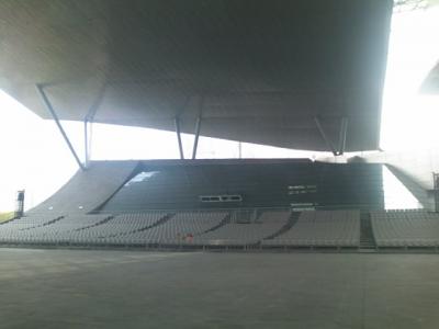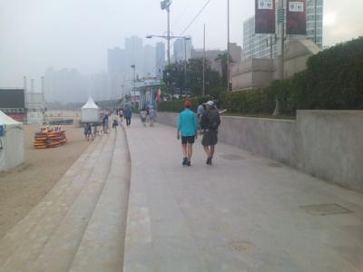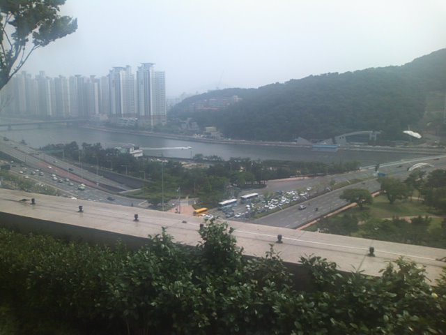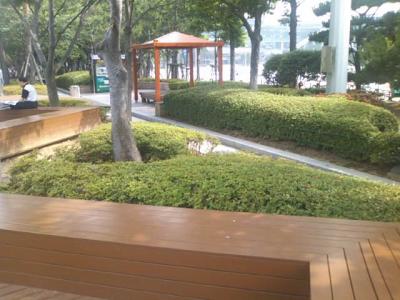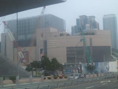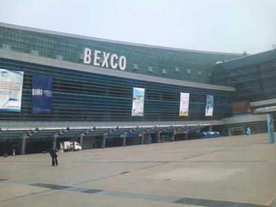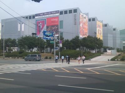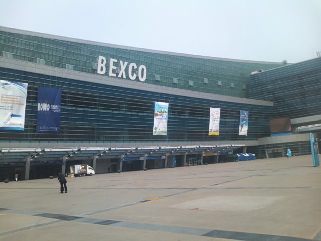 こちらの施設は、釜山で開かれる大型コンサートや、国際規模の色々なイベントで使用されることでも知られる巨大な複合施設で、二つの展示館と多目的ホールであるオーディトリアムがあり、三棟が連なって弧を描くように連なる景観は圧巻です。ただ、イベントが開催されていない時は、あまり用がないかなという印象を抱く施設ですが、丁度中央部には、木陰の脇にベンチが並ぶ一角があって、飲料自販機なども設置されていますので、休憩スポットしても活用できる場所だと思います。