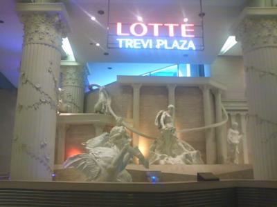 韓国を代表する百貨店のロッテですが、こちらのセンタムシティ店に関しては、すぐ隣に世界最大級の百貨店として知られる新世界百貨店の店舗があるため、相対的に小さく、可愛らしく見える風情の店舗です。地下入口には、釜山ロッテジャイアンツの選手のパネルが貼られた柱などが並んでいて、ロッテの雰囲気を満喫できます。同じ地下入口には、イタリアのトレビの泉を模した箇所もあります。