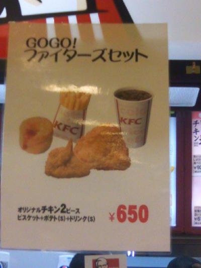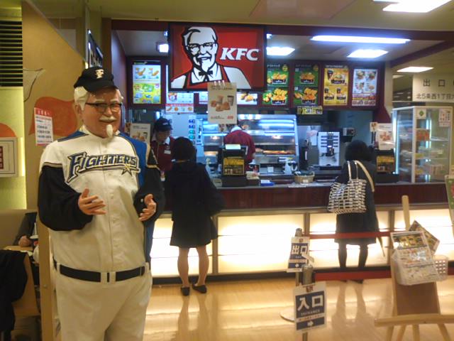 これは期間限定のことなのかもしれませんが、今回の私の訪問時、こちらの店ではGO!GO!ファイターズセット、というメニューが販売されていまして、カーネルおじさんもファイターズのユニホームを着てお出迎えしてくれました。お店自体はフードコート内の一角にあるという感じで、客席も他店との共同スペースとなり、常に混雑している印象がありますので、長居には向かない店舗かと思いますが、野球好き、ファイターズ好きの方は、是非足を運んでみて下さい(期間限定で終了していたらごめんなさい…。)。
