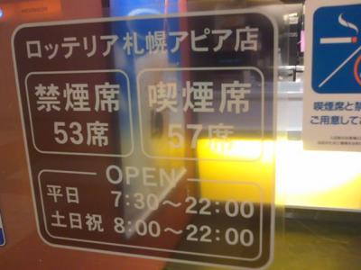 こちらのロッテリアは、アピア飲食店街入口付近の人通りが多い場所にあって、常に混雑して長居客を歓迎しておらず、電源を使わせて頂けないために、個人的には他の店舗に足を運ぶことが多いので今まで気付きませんでしたが、朝の営業時間が、平日と土日祝日とで微妙に異なっていました。後者は30分遅い開店となりますので、利用をお考えの方はご注意下さい。