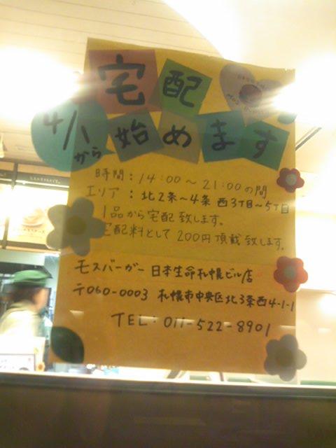 札幌の地下歩行空間内にある、唯一のバーガー系ファストフード店がこちらのモスバーガーとなります。地下歩行空間のオープン時間後まもなくの7時から、つまり通常のモスバーガー店舗と同様の時間で朝モスが楽しめますし、悪天候時でも外を歩かずにアクセスできるので、利用価値は高いお店かと思います。他店と共同にはなりますが、目の前にイートインスペースも用意されているのも良いです。尚、2014年の4月から、宅配サービスも始めたそうで、手書きの案内告知が温かみありました。