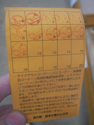国道40号線沿いの剣淵町域内にある道の駅ですが、ここではスタンプカード制度がまだ現役で頑張っていて、500円お買い上げ(レストランでの飲食も含む)で1個押してもらえるのを、20個貯めると、500円分の商品券(同道の駅内でのみ使用可)と交換してもらえるというルールです。