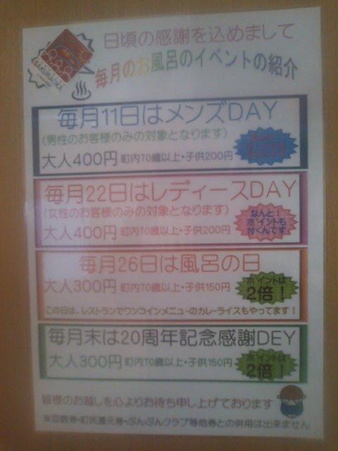こちらの温泉施設は、数年前に日帰り入浴料金が400円から500円へと値上がりしましたが、その分、割安で入れる日の設定が増えて、2014年現在で風呂の日(26日)と月末は300円で入れる上に、スタンプ二倍サービスも開催している他、メンズデー・レディースデーなどの設定もありますので、出来れば日付を選んで利用すればお得な温泉だと思います。
