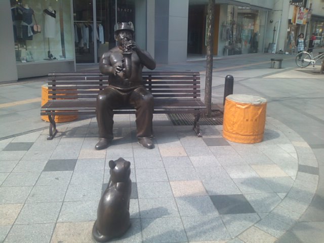 旭川のタウン誌などでも表紙を飾ったりするほど、人気のある像となっていますが、この像の魅力は、買物公園通り沿いにある抜群の立地と、一緒に記念撮影できるようにレイアウトされているデザインでしょうか。また、冬季はマフラーをしたり、手前の猫ちゃんもお帽子を被っていたりする姿が愛らしくて、人気の観光スポットになっています。