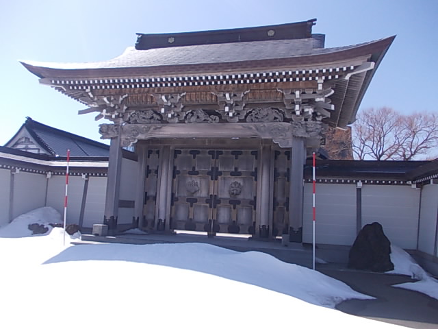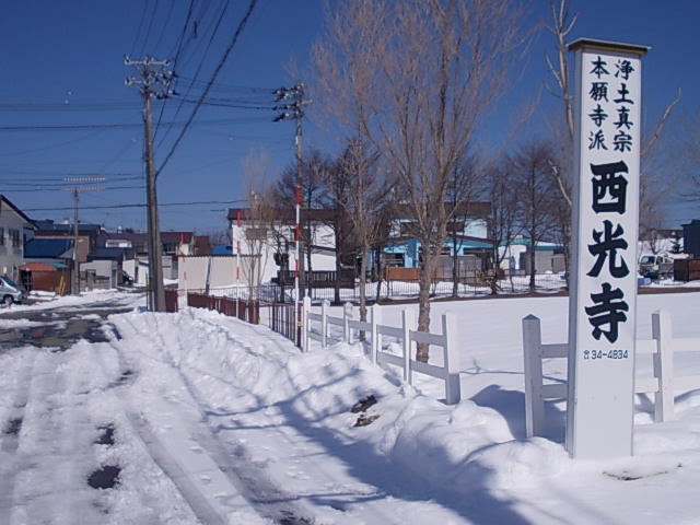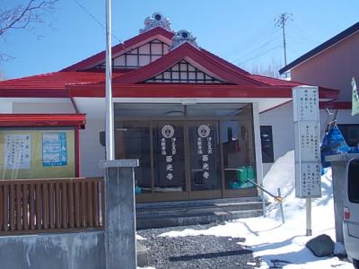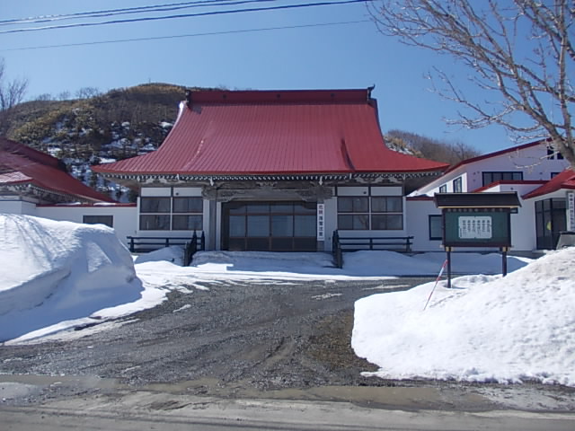 このお寺は、稚内市街地から南東部に向かったところにある富岡団地の最奥、若葉台付近に立地していて、距離的にはかなり歩く覚悟が必要なお寺です。団地内でも一番高台に立地していますので、萩見方面から歩くとずっと登り坂になるのも大変ですが、富岡団地を循環ルートで運行する宗谷バス路線も稚内駅・南稚内駅方面から運行されていますので、こちらの利用が便利だと思います。お寺に関しては、赤い屋根が印象的な本堂で、入口付近にかつてバス停だったと思われる物に、有り難いお言葉が幾つか記されていたのがユニークでした。