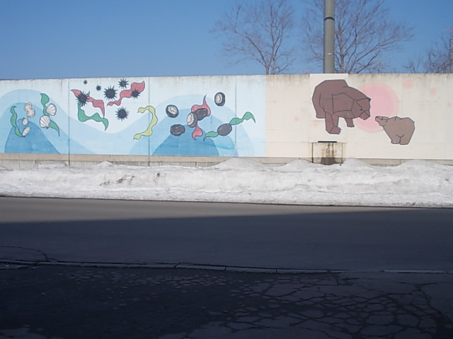 ここはプールや体育館、更には野球場などがあって、町民がスポーツを楽しむ場として定着している運動公園ですので、観光客の方が立寄るべき名所ではないような気がしていましたが、実際に訪れてみると、ここは丁度函館本線の線路沿いにあるのですが、その外壁を利用して、地元の高校生達による八雲に関する風景画や、八雲が発祥として知られている木彫りの熊などが描かれていて、なかなか見応えがありました。野外美術館のようなテイストを運動公園の脇で楽しめる、というギャップも面白いかなと思います。