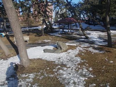 ここは湯の川温泉のホテルが立ち並ぶ地区のすぐ近くにありますので、オンシーズンですと、湯上りの散歩などに最適の場所だと思います。普通の公園のレイアウトの中で、松の木が沢山並んでいる光景はちょっと独特だと思います。改めてこのエリアが海に近いんだなということを再認識させてくれる公園です。