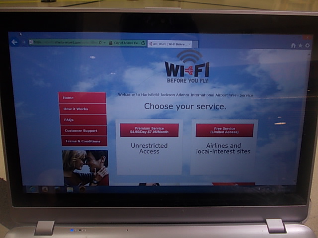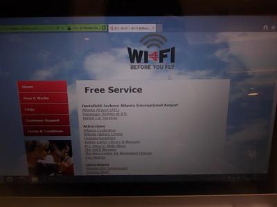 アトランタ国際空港(ATL)でのインターネット環境に関しては、空港が提供しているものとしては基本的にWifiは有料となりますが、アトランタ市内の観光地情報など、一部サイトに関しては無料で使用することが出来ます。面白いのは、ATLはDL(デルタ航空)のハブ空港なのに、DLサイトは無料ではアクセスできず、寧ろ、UA(ユナイテッド)やAA(アメリカン)、US(USエアウェイズ)などのサイトは無料対応していました。尚、実はATL内では一部レストランなどが自前でゲスト向けの無料Wifiを提供していたりしますので、無料に拘りたい方は、各レストランで対応の可否を尋ねてみると良いかと思います。(因みに空港サイトのWifiも1日500円程度で無制限利用できますが…。月契約ですともっと割安です。)