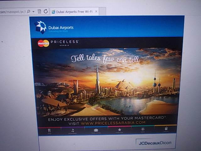 UAEのネット環境に関しては、まだまだ場所によって差があるように感じましたが、一応、私がドバイの空港でWifiの波を探した所、ドバイ空港のフリーWifiを見つけることが出来ました。トップページに広告が表示されるので、恐らくスポンサーからの広告費で運営されているのだと思います。それ故か、1時間毎に怪しげなポップアップのようなものが表示されて断線するのが面倒でした。ショッピングモールなどでも無料Wifiが使える所もあるようですが、結構有料の所も多いので、根気よく無料Wifiを探すことも必要だと思います。尚、ドバイは新空港が誕生しますので、新しい空港ではまた状況が好転している可能性もあるかと思います。